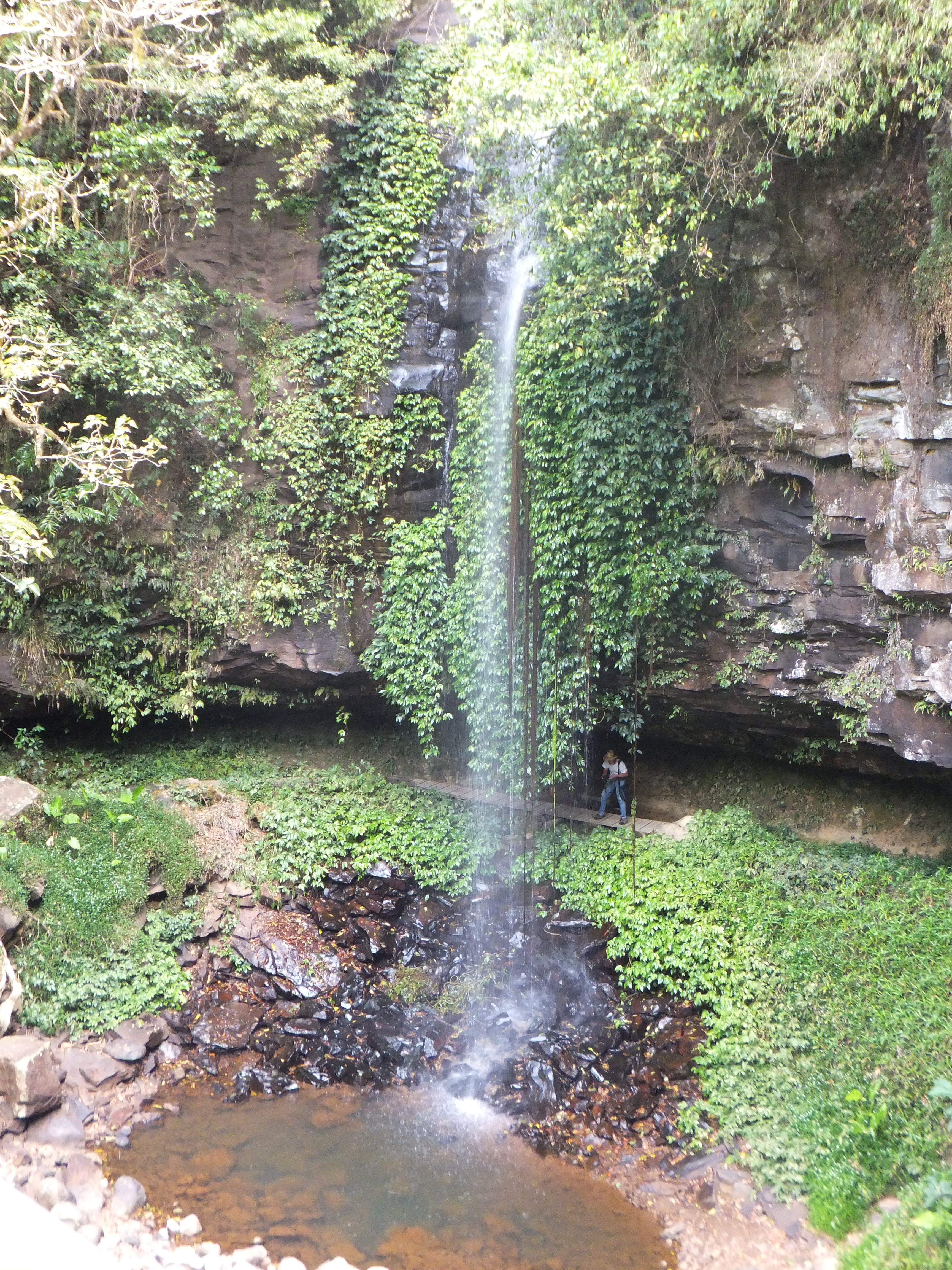 The main interest in this walk was the profusion of plant life, with information boards along the way pointing out a 440-year-old tree, or warning us of lawyer vines (tiny spines under the leaves and on trailing whips, which don’t let go) or a poisonous tree with huge leaves. We heard birds all around us, especially Whip birds and Cat birds – both names refer to their calls – but sadly saw few. We were entertained by some scrub wrens – yellow-browed and white-throated – flittering around and then busily rootling in the scrub. Every now and then the forest opened up showing the surrounding mountains or a flame tree bright in the sunlight.